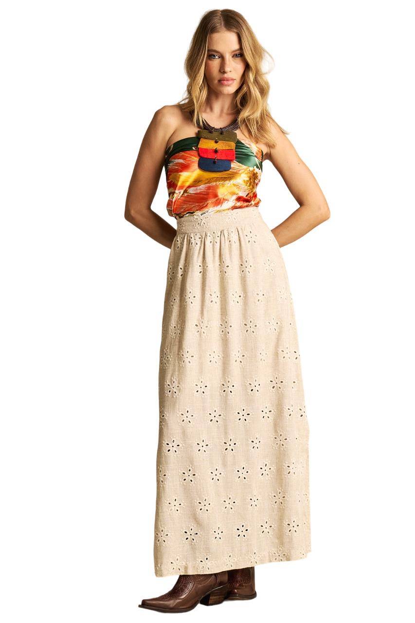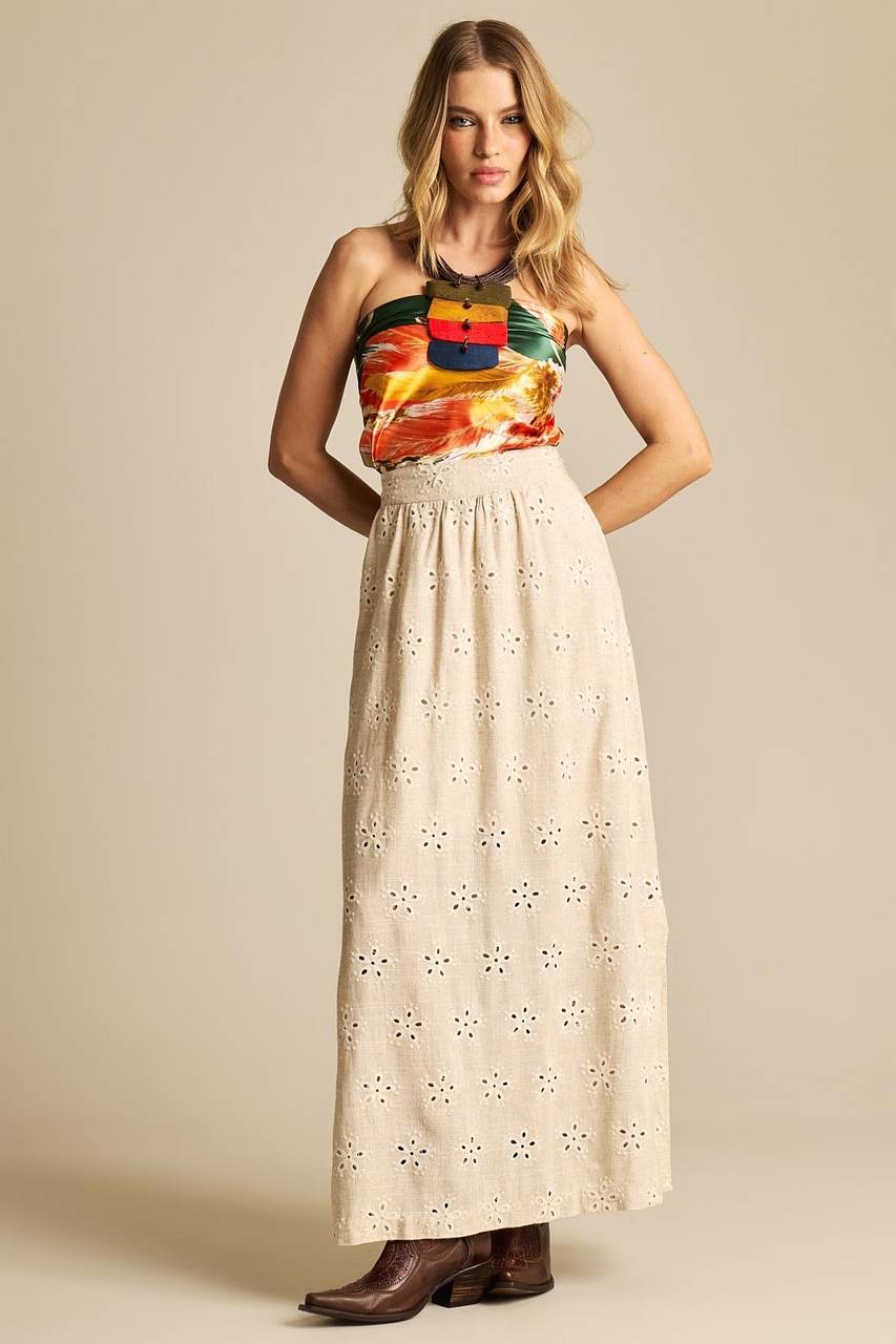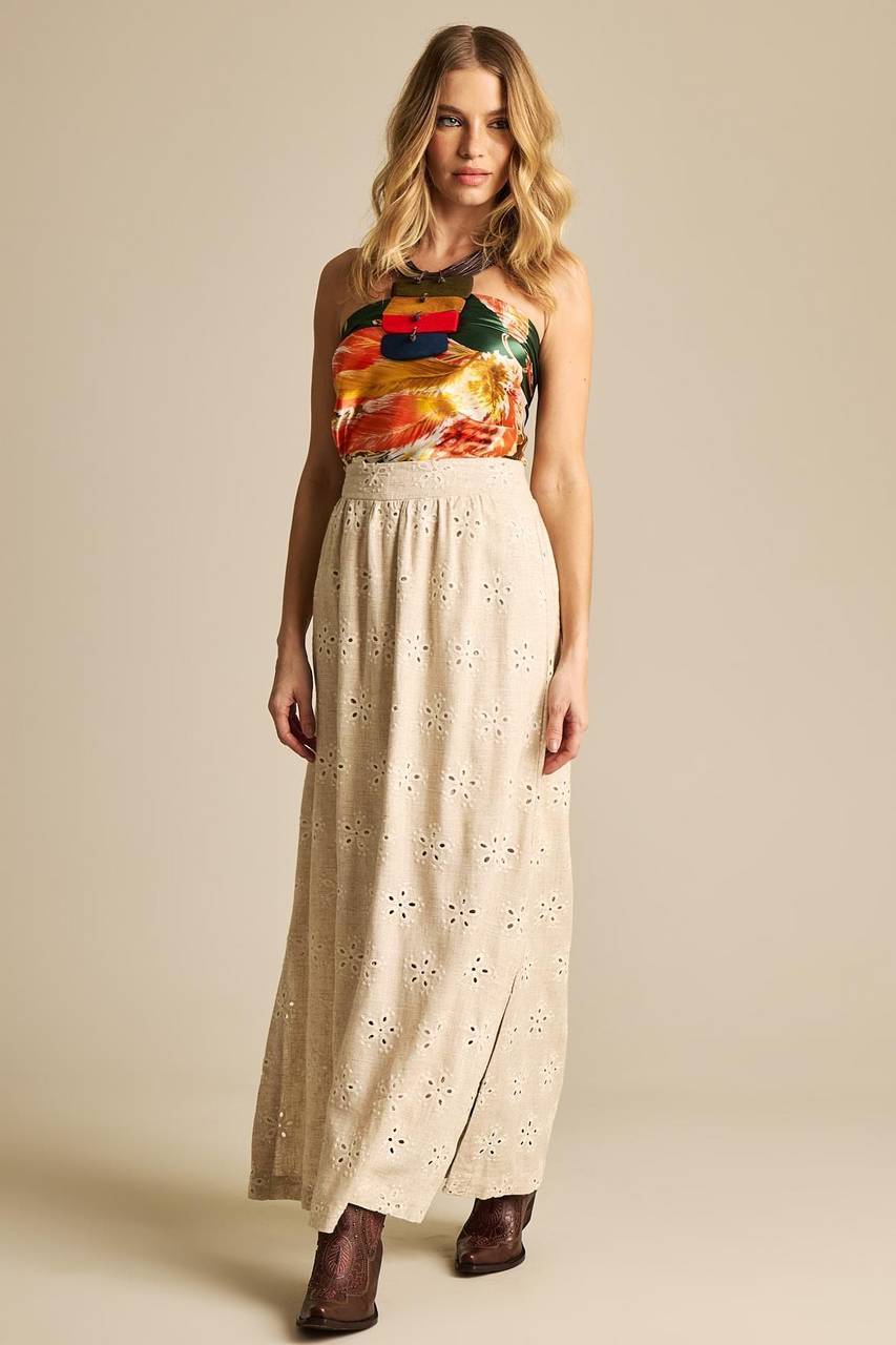 Saia Longa De Linho Evasê Bege Bordada Yacamim I8