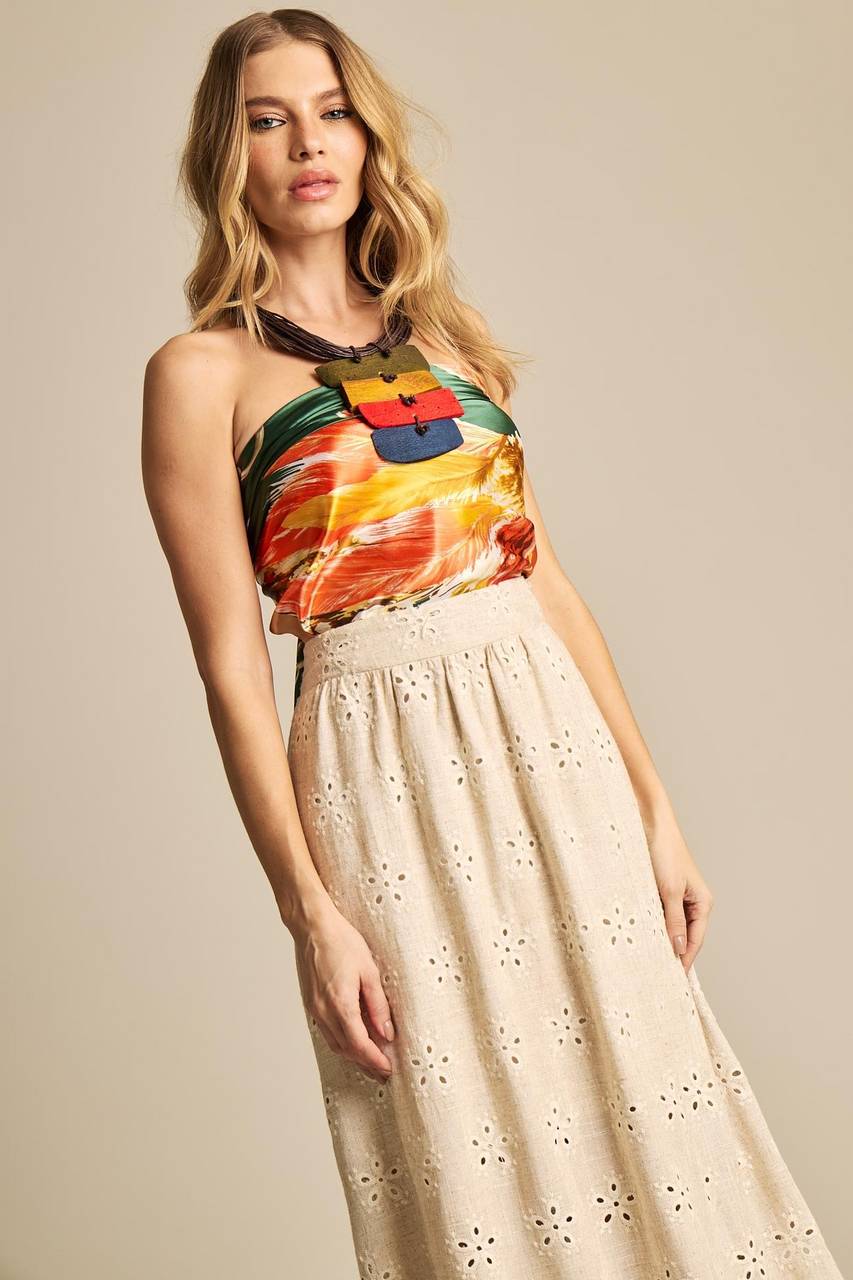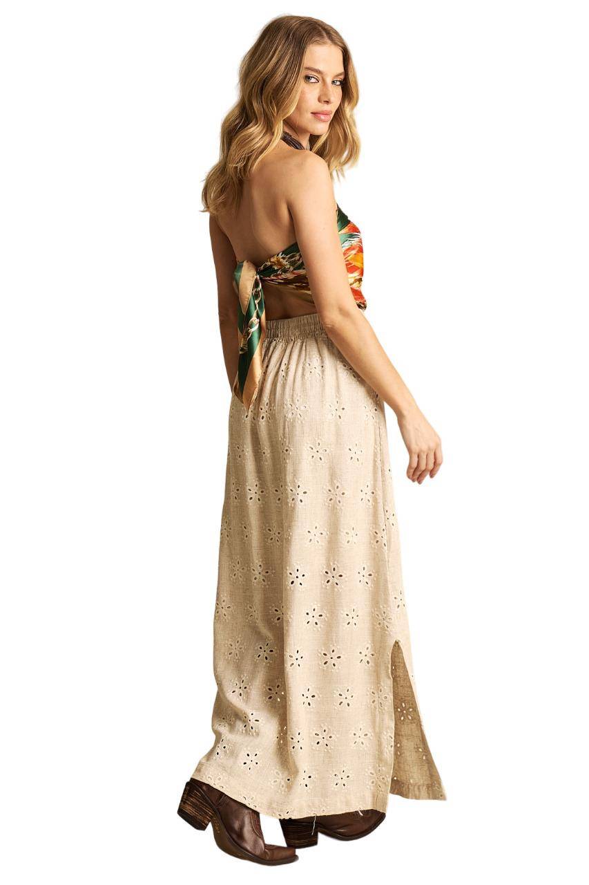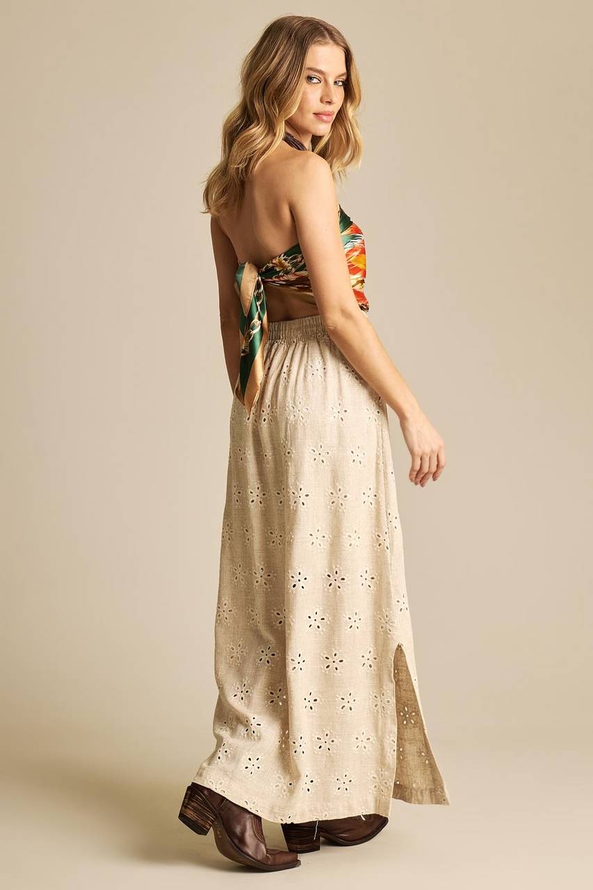 Saia Longa De Linho Evasê Bege Bordada Yacamim I8